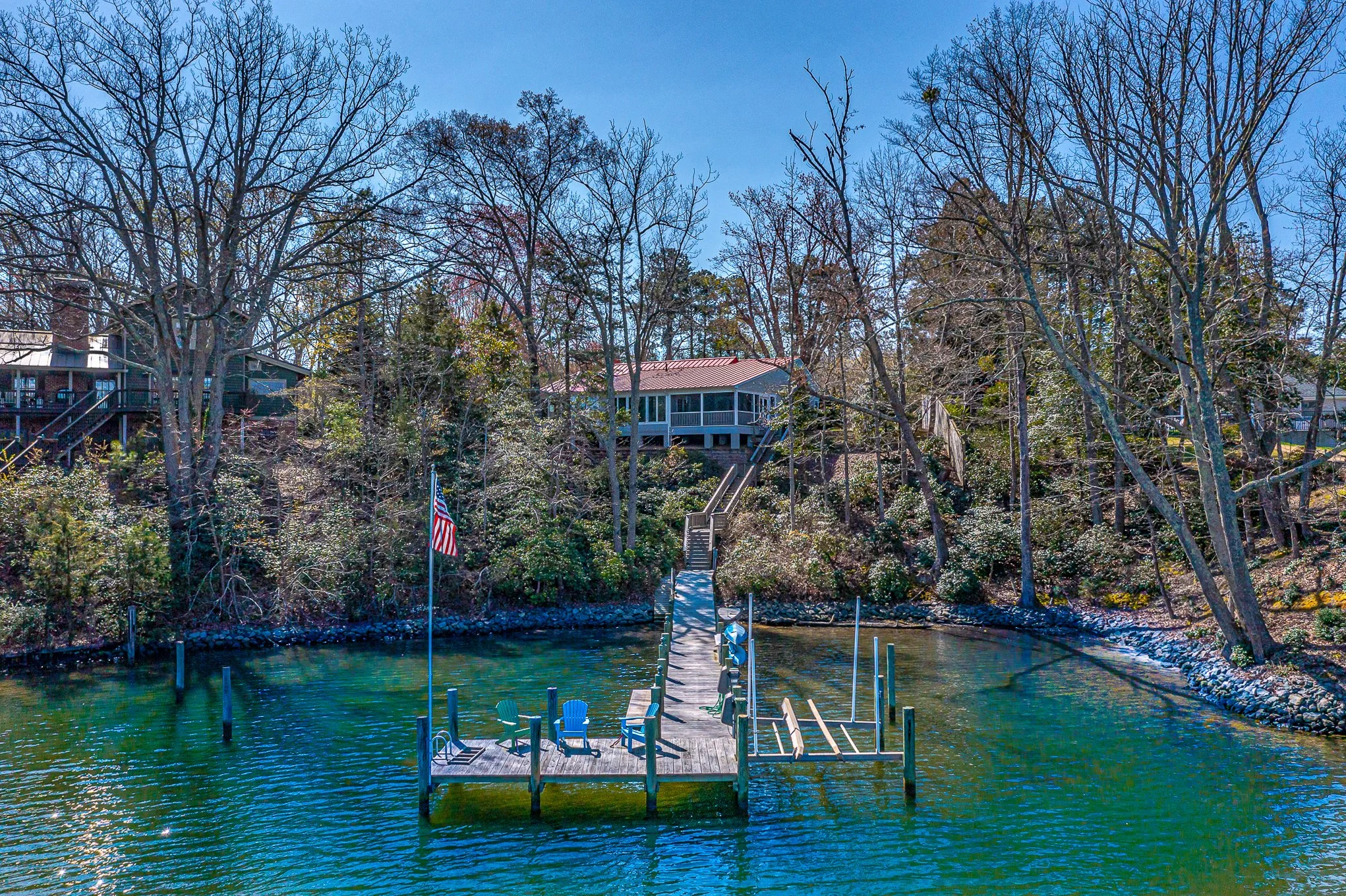“Bermuda,” a classic cottage with an island motif, offers a charming retreat on a knoll overlooking Carters Creek. This home exudes romance with a casual yet sophisticated character. A covered porch provides a warm welcome. Mature trees frame the private, park-like yard, which includes a large garden shed. The well-equipped dock consists of a deck, a boat lift, and a kayak launch platform.